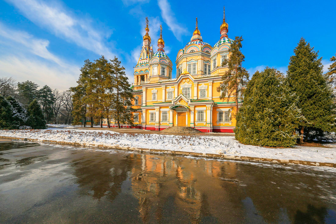 Возведение главного храма тогда еще Туркменской епархии началось в 1906-м. При советской власти в нем находились общественные организации, в результате чего сильно пострадало внутренне убранство. В 1982-м собору был присвоен статус памятника культуры, и сейчас это главный православный храм Алма-Аты.