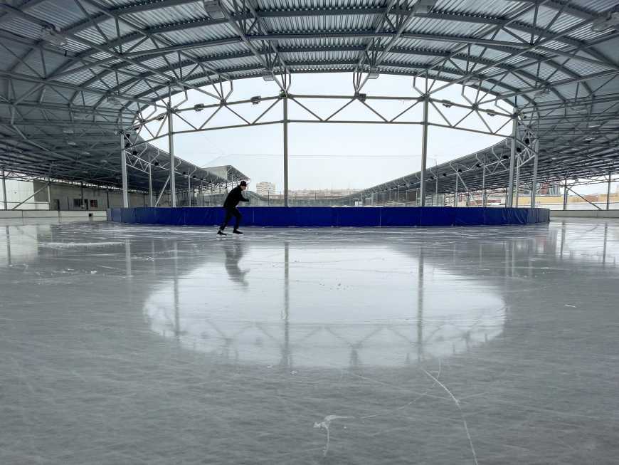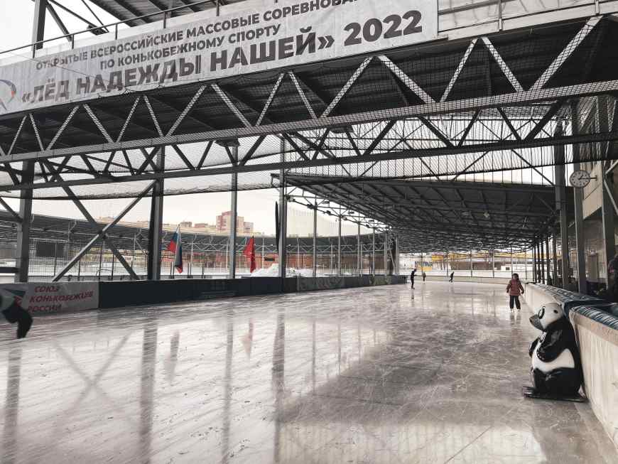 Что уникального: это самый большой в городе каток, площадь его составляет 24500 тыс м2. Конькобежный трек находится под навесом, поэтому здесь комфортно кататься даже под декабрьским дождем.