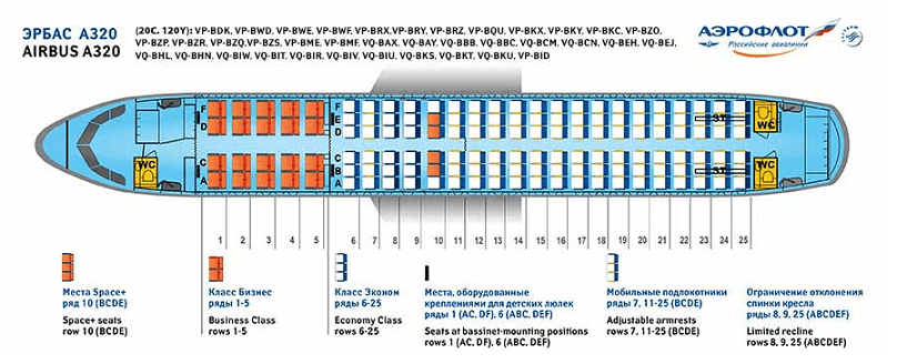 Нумерация мест в самолетах Аэробус А320 Аэрофлот