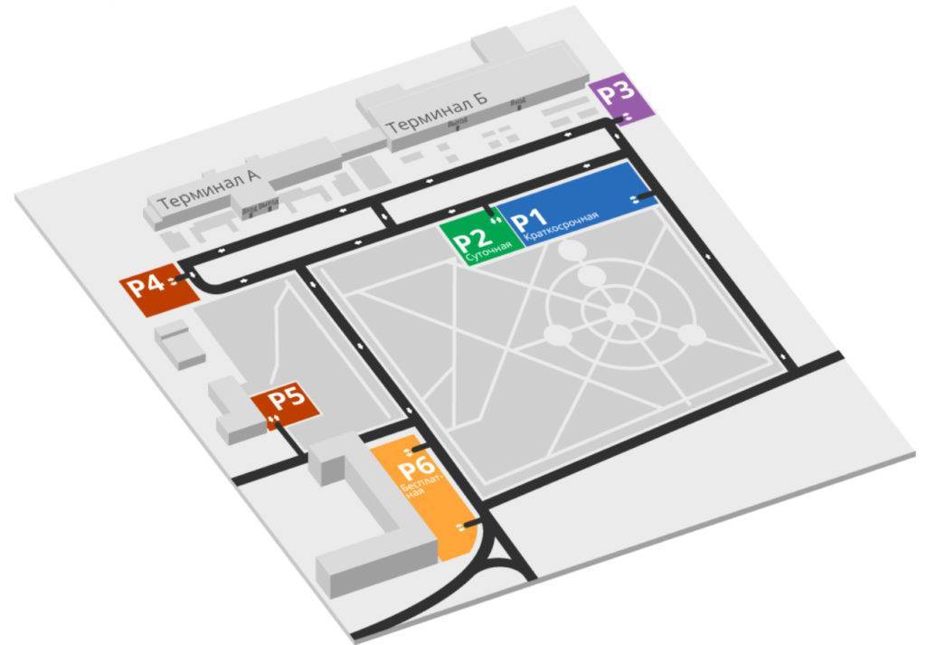 Р1: расположена на привокзальной площади в 50 метрах от терминала Б. Рассчитана на кратковременную стоянку 200 машин. Место указывает инспектор-контроллер.