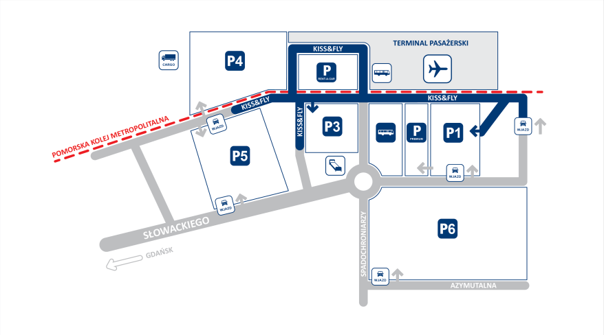 Паркинг в аэропорту Гданьска имеется платный и бесплатный. Бесплатная парковка KISS and FLY нужна, чтобы встречающие могли подъехать близко к зданию, забрать пассажиров с багажом и сразу уехать. Ее использование бесплатно в течение 10 минут. Каждая минута сверх лимита обойдется в 1 злотый.