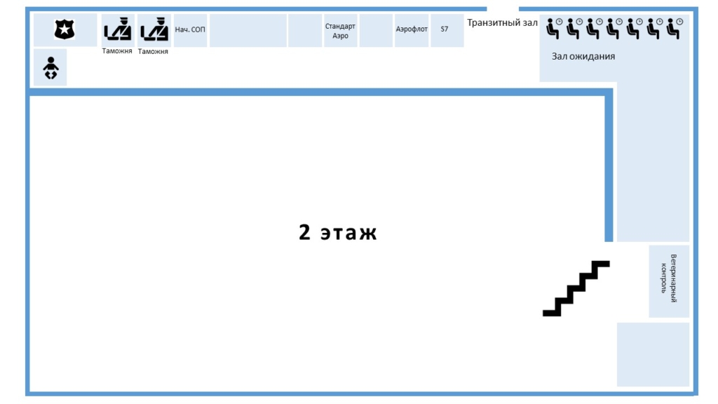 Здание аэропорта по площади небольшое. На втором этаже залы для ожидания рейсов, на первом – зал прилета и выходы на посадку.