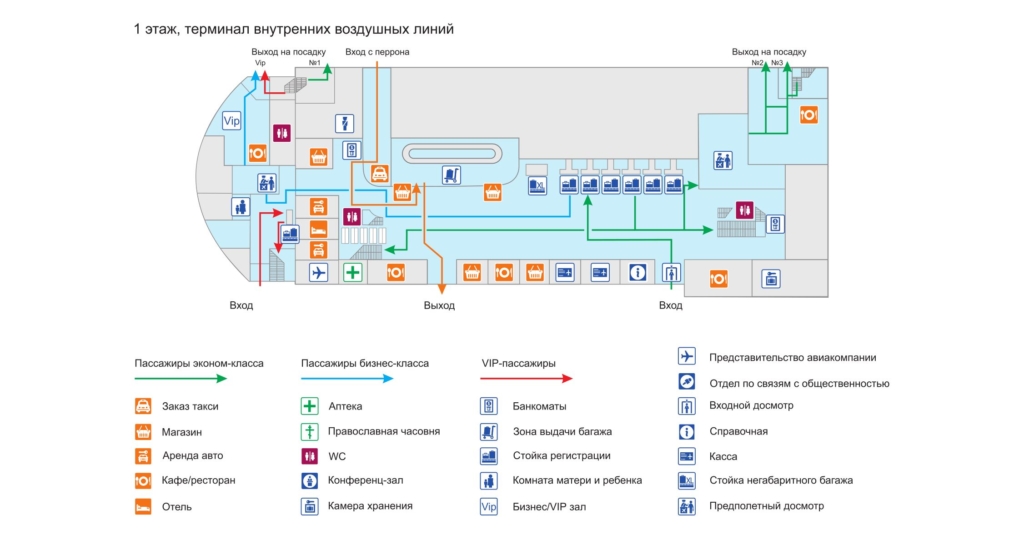 Терминал для обслуживания внутренних авиалинимй включает 4 этажа. На них находятся: