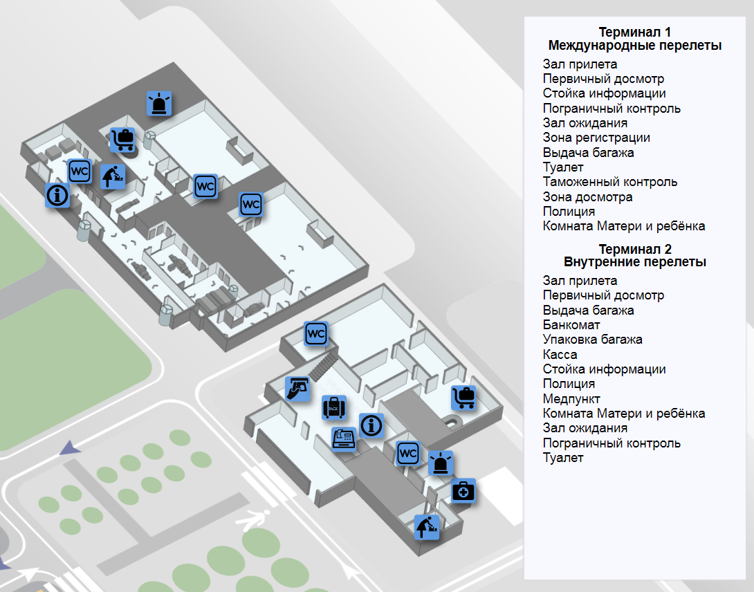 Схема терминалов внутренних и международных авиалиний Международного аэропорта Калуга (Грабцево):