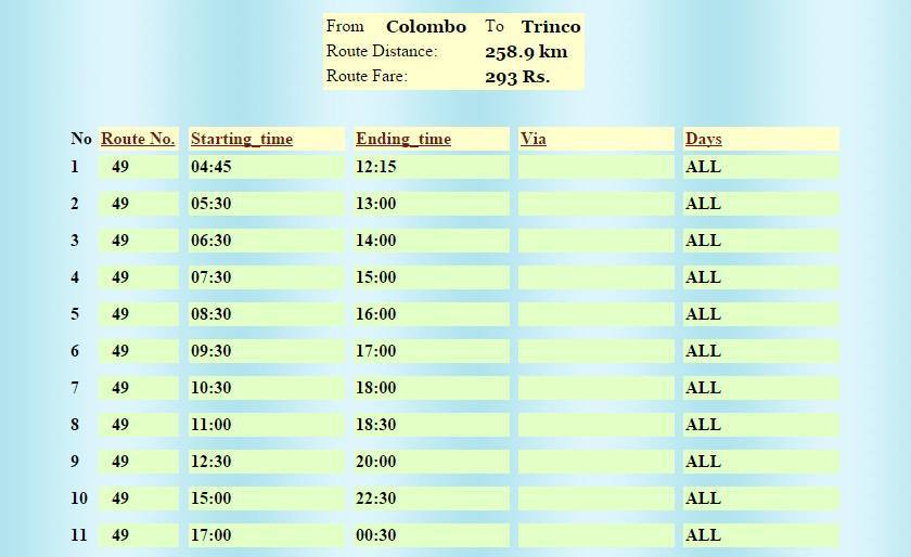 Прямой городской автобус № 49 (Trincomalee — Colombo) отправляется от автостанции Коломбо. Время в пути 8-10 часов, все зависит от ситуации на дорогах. Стоимость билета 293 рупии. Место отправления — центральная автостанция недалеко от ж/д вокзала Colombo Fort (см. на карте). Автобус Коломбо-Тринкомали ходит примерно 1 раз в час, начиная с 4:45 и до 17:00.