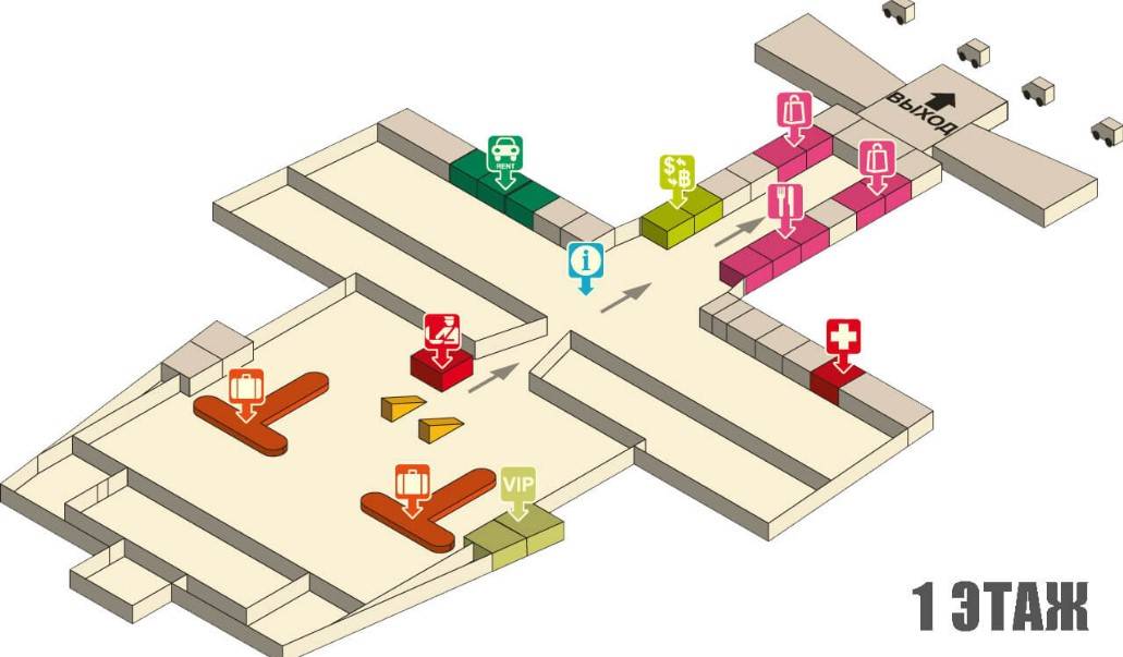 Терминалы состоят из 4-ех этажей. Практически все основные объекты инфраструктуры расположены на первом. Здесь же пассажиры получают свой багаж, после чего по широкому коридору отправляются в сторону выхода. Перед самим терминалом расположена большая парковка, немного дальше автомобильная трасса и остановка общественного транспорта.