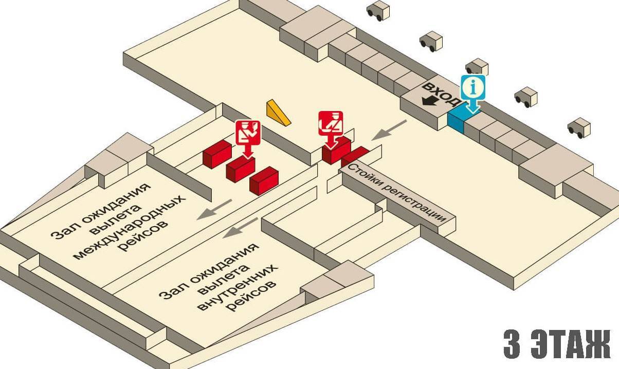 Третий этаж работает с вылетающими пассажирами. Здесь установлены стойки регистрации на рейсы, а также ленты для упаковки багажа. Зарегистрировавшись на рейс, пассажиры попадают в зону паспортного контроля, а затем в зал ожидания. Всю информацию о рейсах можно получить на электронных табло.