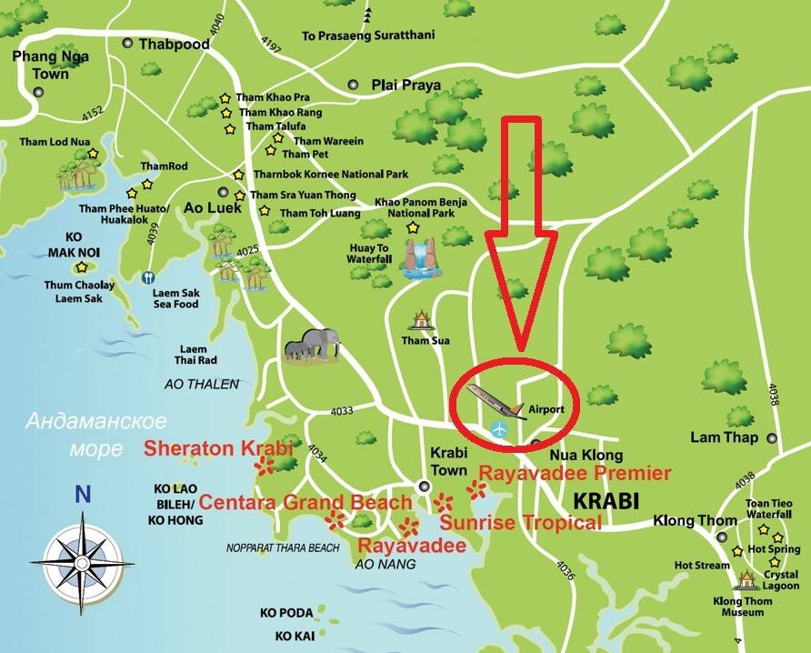 Чтобы доехать до аэропорта, можно использовать вышеописанные виды транспорта, только заказывать его придется в уже городе. Перед самостоятельной поездкой на арендованном автомобиле нужно посмотреть расположение аэропорта Краби на карте.