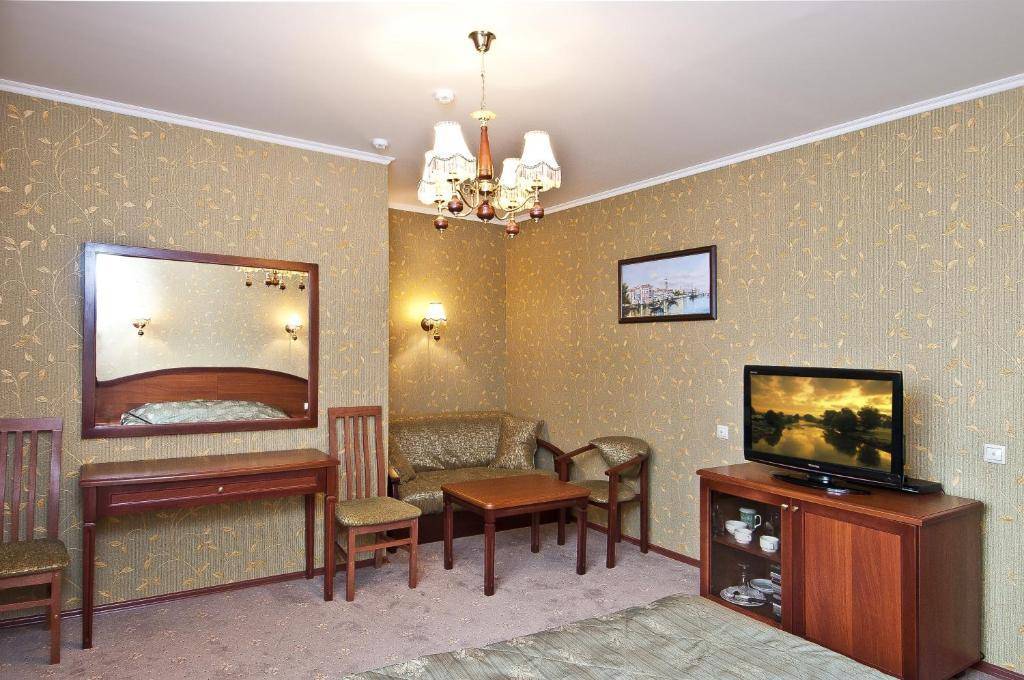 В оплату входит халат, тапочки, утюг. По утрам завтрак «шведский стол» и разнообразное меню. Цена – 2080-6200 рублей за ночь.