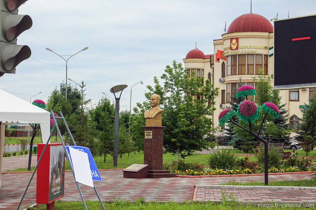 Если же из города двигаться по центральной улице Осканова в северо-восточном направлении, то следует ехать без поворотов почти 14 километров. Затем, ориентируясь на указатели, свернуть направо, где улица Осканова перейдет в улицу Джабагиева, по которой можно доехать до аэропорта. Необходимо будет лишь свернуть еще раз налево через 10,5 километров, чтобы попасть к подъездной дороге, указанной в предыдущем маршруте.