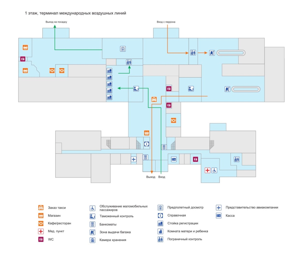 На первом этаже расположились терминалы, которые предназначены для внутренних и международных рейсов. От входа в аэропорт справа находится буфет, слева – камера хранения и кассы.
