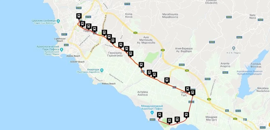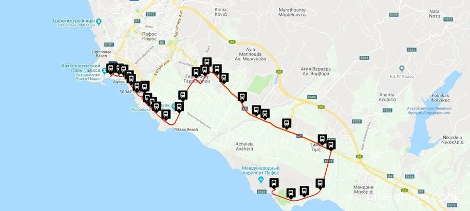 - №613 отправляется только в 8:00 и 19:00, курсирует круглый год. Его путь проходит через побережье Пафоса.