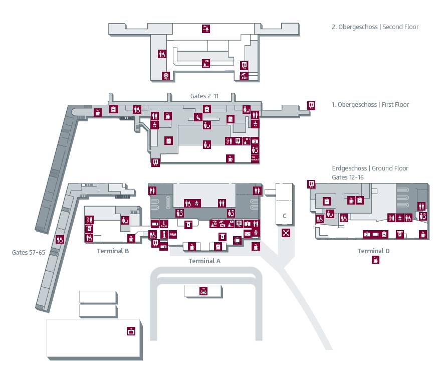 Основные сервисы в терминалах находятся на первом этаже (Ground Floor). Здесь располагаются зоны вылета и прилета, залы ожидания, стойки регистрации, информационные службы, ленты выдачи багажа, камеры хранения и другие необходимые службы, на всей территории аэровокзала работает бесплатный Wi-Fi. На втором этаже главного здания (терминал A) располагаются службы паспортного и таможенного контроля.