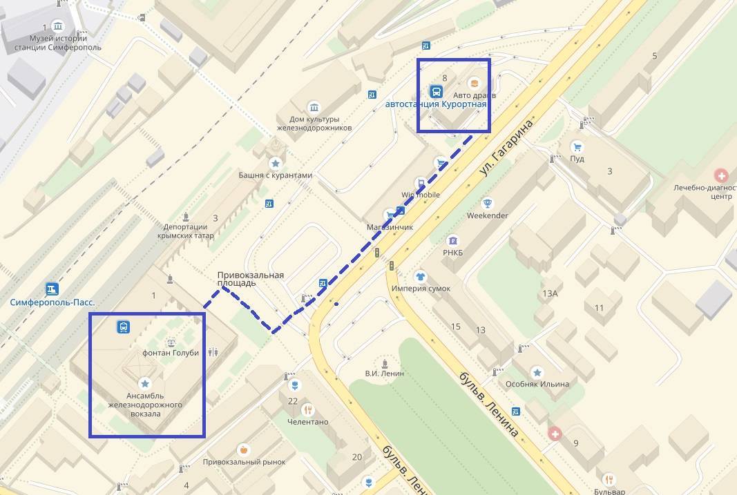 Чтобы попасть от Курортной к вокзалу, нужно стоя спиной к станции повернуть направо и пройти пару минут вдоль ул. Гагарина.