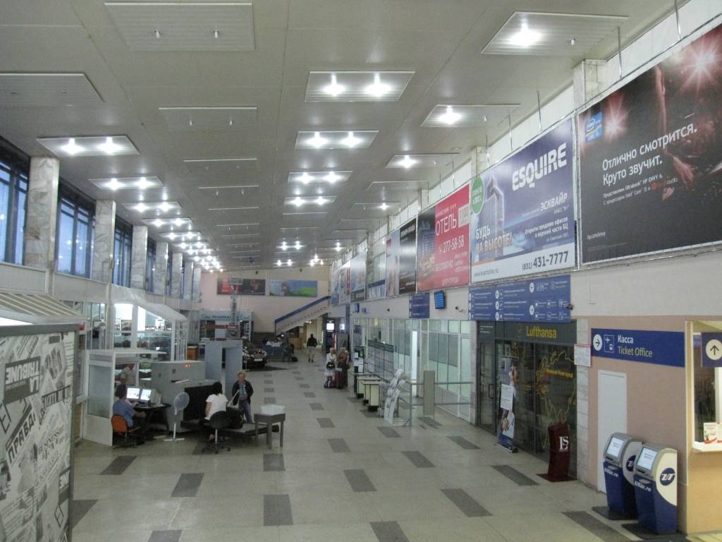 Любая из зон обслуживания воздушного нижегородского вокзала очень большая, клиенты никогда не испытывают стеснения во время ожидания собственного рейса. Регистрация, проверка и транспортировка багажа полностью автоматизированы и занимают считанные минуты.
