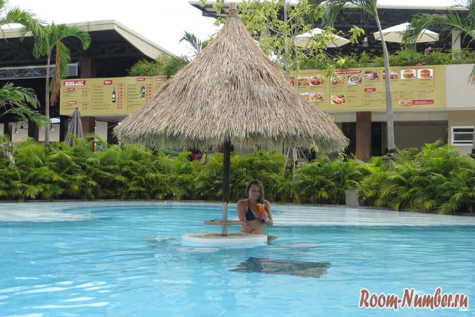 А еще в бассейне у ресторана есть бар прямо в воде. Увидев этот барчик, нам сразу захотелось чего-нибудь там выпить. Отметили, что мы уже так соскучились по 5-звездочным отелям с системой «всё включено», в которых раньше отдыхали, когда ездили по путёвкам. Взяли свою любимую «Текилу Санрайз».