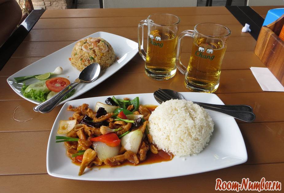 Мы заказали жаренный рис с креветками, рис с мясом, сыр тофу в панире и 2 пива. Обед получился очень вкусным, поели с большим удовольствием. Вышло около 450 бат за все. В меню немалый список блюд, как тайских, так и европейских. В среднем, на семью с ребенком закладывайте примерно 1000-1200 бат за вкусный и плотный прием пищи с напитками.