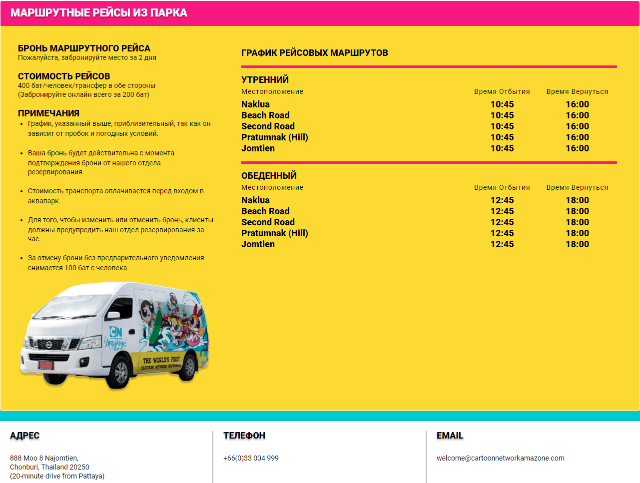 Картун Нетворк Амазон находится в 20 км от центра Паттайи, в районе Джомтьен, что к югу от курорта (см. ). Доехать до него можно, арендовав автомобиль, и двигаясь по трассе №3 Sukhumvit Road. Координаты GPS: широта 12.785237, долгота 100.914940. Еще один способ: трансфер от Картун Нетворк Амазон – собственный микроавтобус аквапарка, который по расписанию развозит клиентов. Подробности на рисунке ниже: