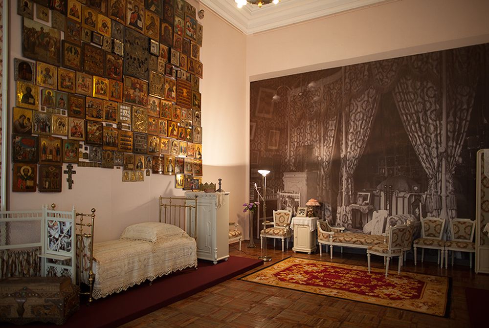 В спальне Александры Фёдоровны над кроватью стены плотно завешаны иконами.