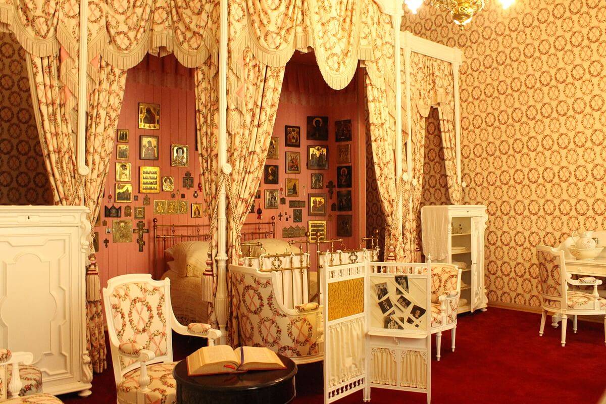 Спальня царской четы удивляет простотой обстановки. Ткань из английского вощеного ситца с рисунком из венков цветов, которой отделан альков, служит главным украшением помещения. На стенах много икон, в начале XX века их было более 700.