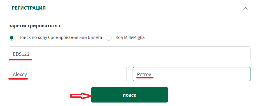 - либо свой личный код участника программы MilleMiglia (если вы указывали его при покупке билета) и свою фамилию на английском языке.