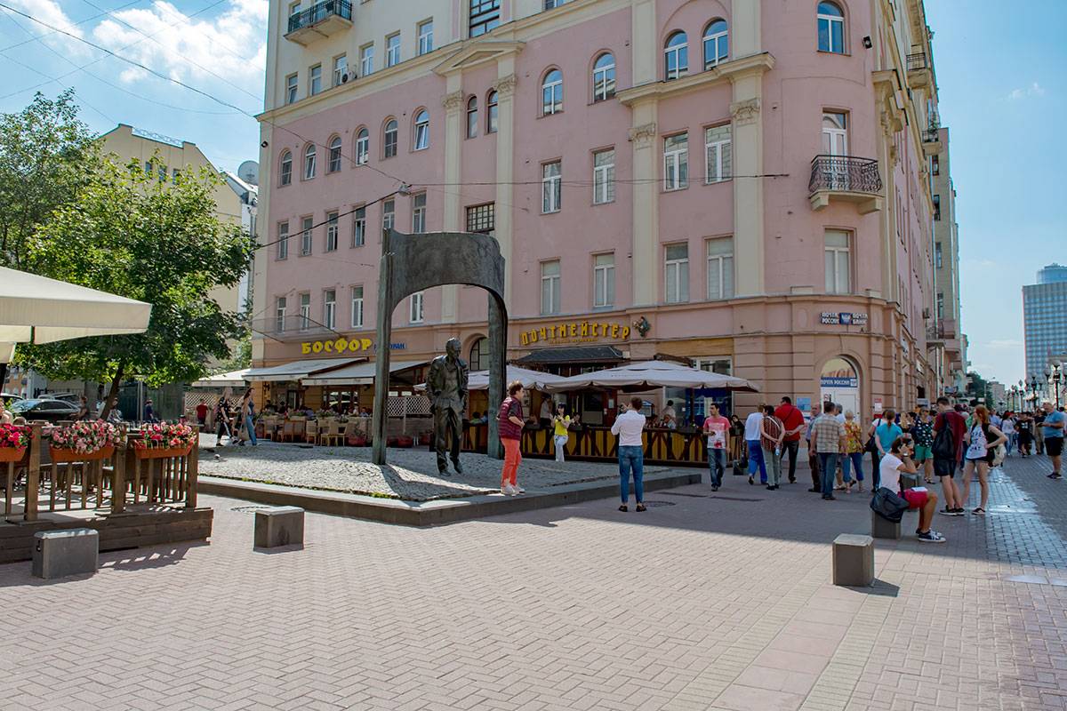Отвоевать под монумент столь значительную площадь, оставленную почти пустой, наверняка стоило больших усилий. Две расположенные на приличном расстоянии арки символизируют типичный двор, какими Старый Арбат запомнился коренным жителям. Гостеприимно выглядят лавочки между подворотнями, а хозяева окрестных общепитов с завистью поглядывают на вожделенную территорию.