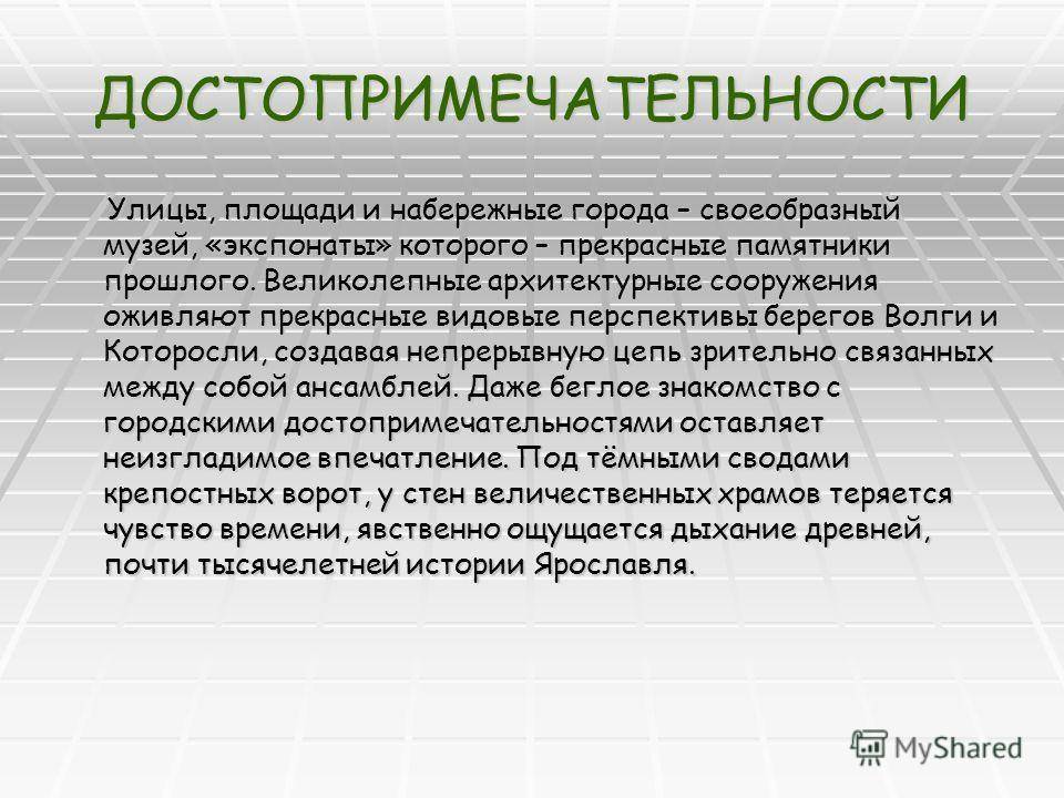 ДОСТОПРИМЕЧАТЕЛЬНОСТИ Улицы, площади и набережные города – своеобразный музей, «экспонаты» которого – прекрасные памятники прошлого. Великолепные архитектурные сооружения оживляют прекрасные видовые перспективы берегов Волги и Которосли, создавая непрерывную цепь зрительно связанных между собой ансамблей. Даже беглое знакомство с городскими достопримечательностями оставляет неизгладимое впечатление. Под тёмными сводами крепостных ворот, у стен величественных храмов теряется чувство времени, явственно ощущается дыхание древней, почти тысячелетней истории Ярославля. Улицы, площади и набережные города – своеобразный музей, «экспонаты» которого – прекрасные памятники прошлого. Великолепные архитектурные сооружения оживляют прекрасные видовые перспективы берегов Волги и Которосли, создавая непрерывную цепь зрительно связанных между собой ансамблей. Даже беглое знакомство с городскими достопримечательностями оставляет неизгладимое впечатление. Под тёмными сводами крепостных ворот, у стен величественных храмов теряется чувство времени, явственно ощущается дыхание древней, почти тысячелетней истории Ярославля.
