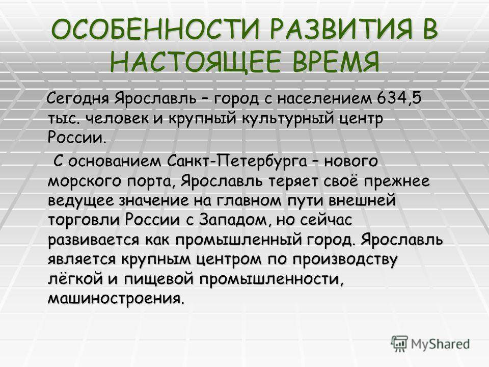 ОСОБЕННОСТИ РАЗВИТИЯ В НАСТОЯЩЕЕ ВРЕМЯ Сегодня Ярославль – город с населением 634,5 тыс. человек и крупный культурный центр России. Сегодня Ярославль – город с населением 634,5 тыс. человек и крупный культурный центр России. С основанием Санкт-Петербурга – нового морского порта, Ярославль теряет своё прежнее ведущее значение на главном пути внешней торговли России с Западом, но сейчас развивается как промышленный город. Ярославль является крупным центром по производству лёгкой и пищевой промышленности, машиностроения. С основанием Санкт-Петербурга – нового морского порта, Ярославль теряет своё прежнее ведущее значение на главном пути внешней торговли России с Западом, но сейчас развивается как промышленный город. Ярославль является крупным центром по производству лёгкой и пищевой промышленности, машиностроения.
