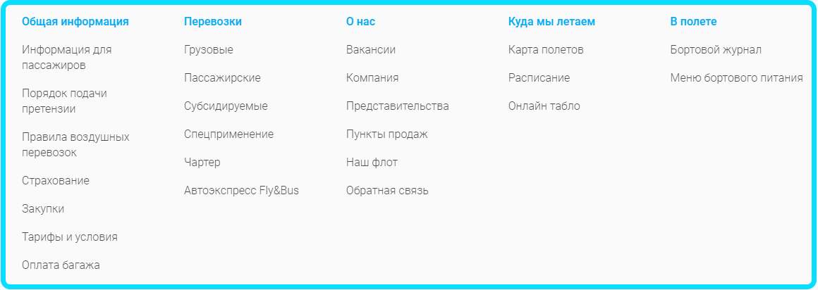 На официальной площадке представлено два основных раздела. В первом (онлайн-сервисы) пользователь может приобрести или вернуть билет, зарегистрировать на рейс или проверить наличие брони. Во втором разделе представлены: