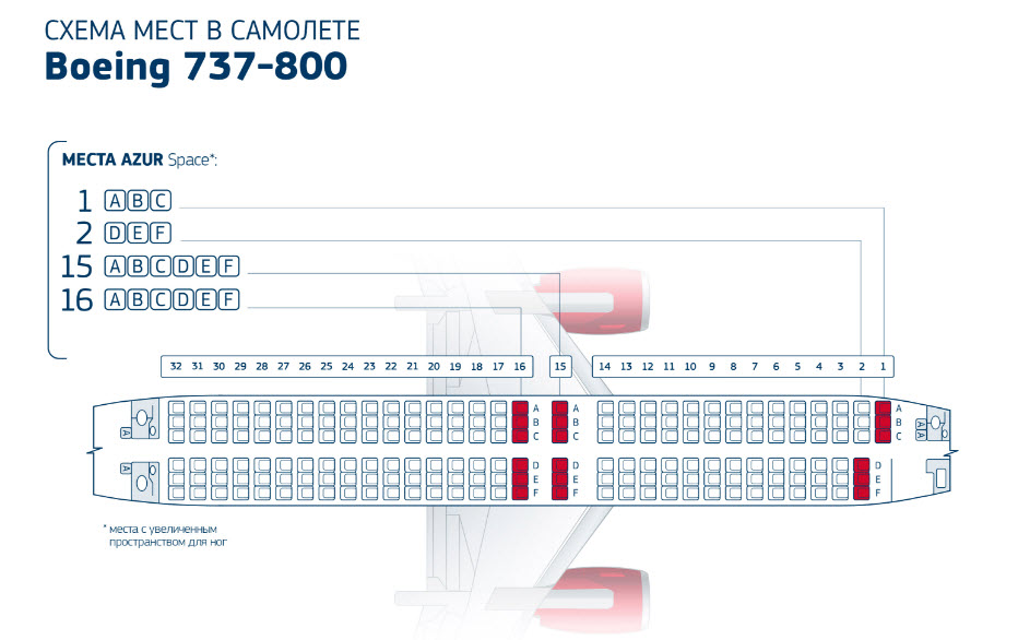 В пассажирском салоне Боинга 737-800 эконом-класса места располагаются двумя блоками по три кресла в каждом ряду. Всего в салоне 32 ряда кресел, расстояние между рядами составляет примерно 0,8 м. Самыми комфортными считаются места с увеличенным пространством для ног, так называемые места Azur Space