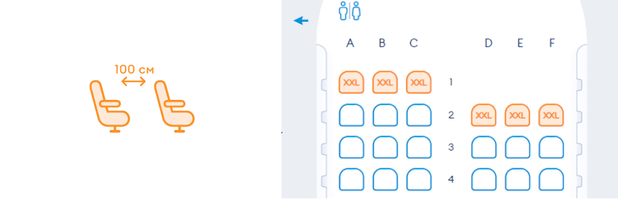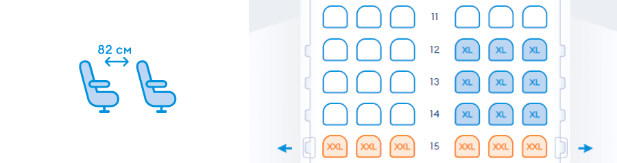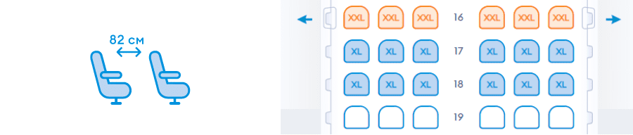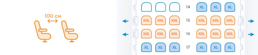 Места повышенной комфортности с повышенной оплатой. Из плюсов – увеличенное место для ног. Из минусов – эти ряды находятся над крылом.