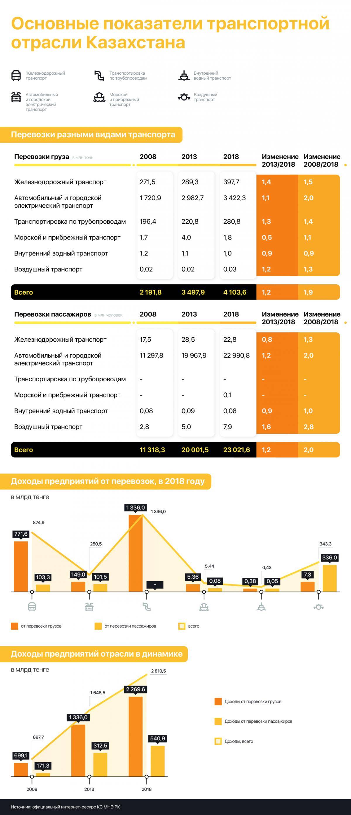 Доходы же предприятий в ушедшем году составили 250,4 млрд тенге, в том числе от перевозки грузов – 148,9 млрд тенге (вся сумма приходится на грузовой автомобильный транспорт) и 101,5 млрд тенге.
