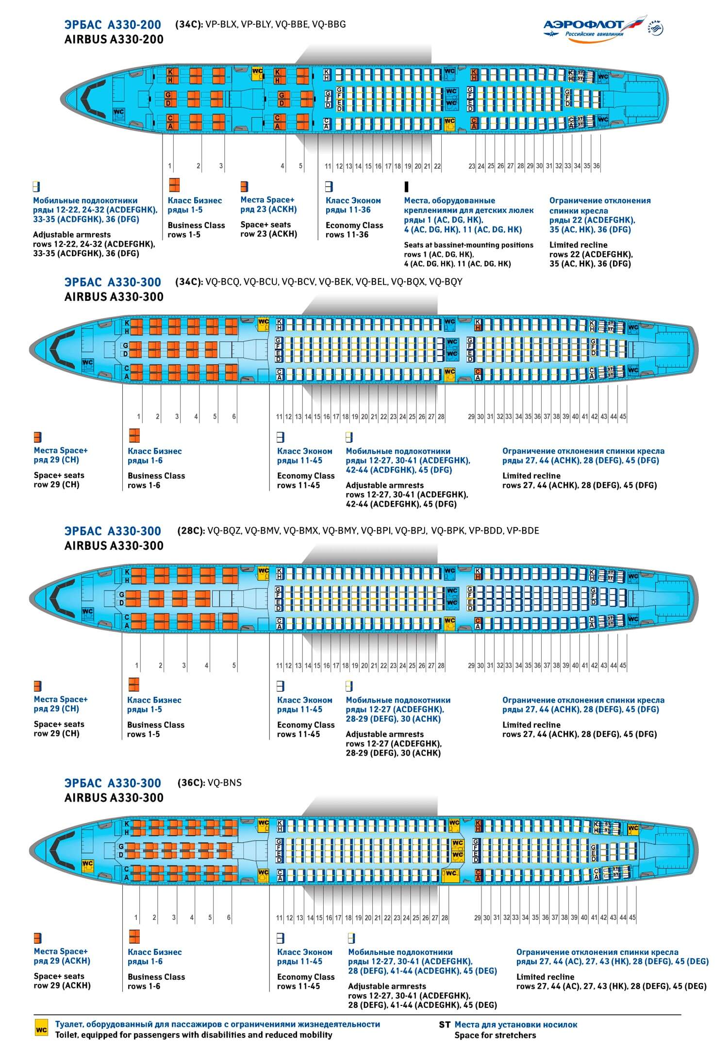 Airbus A330-200 рассчитан на 207 кресел в секторе Эконом и 34 в бизнес-классе. Лайнер Airbus A330-300 более вместительный, в его экономичном секторе 287 кресел, а в бизнес-классе — от 28 сидений до 36 на усмотрение компании.