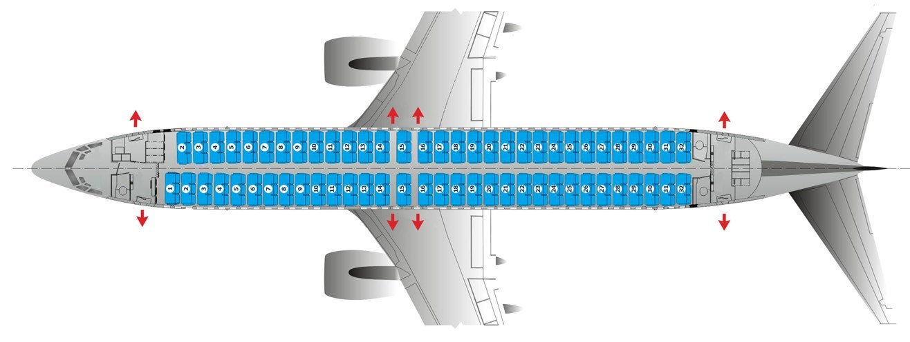 Первая серия аварийных выходов начинается с 14 ряда. С точки зрения безопасности спинки кресел на этих местах либо могут не откидываться, либо будут иметь ограничения.