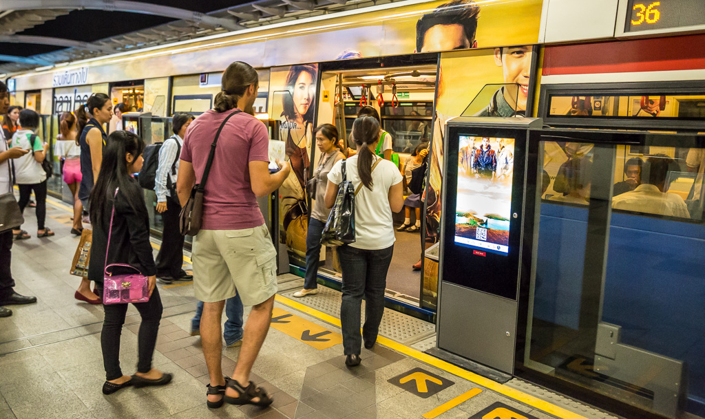Купить билет на Skytrain можно в автомате, выбрав станцию назначения, количество билетов и просунув необходимое количество Бат в монетоприемник. Стоимость проезда на метро зависит от расстояния или количества станций и колеблется от 10 до 40 бат. Если хотите оставить билетик на память, то берите два, так как при выходе билет необходимо будет скормить турникету, который без него Вас не выпустит. Движение поездов осуществляется с 6 утра до полуночи, интенсивность движения поездов увеличивается в часы пик.