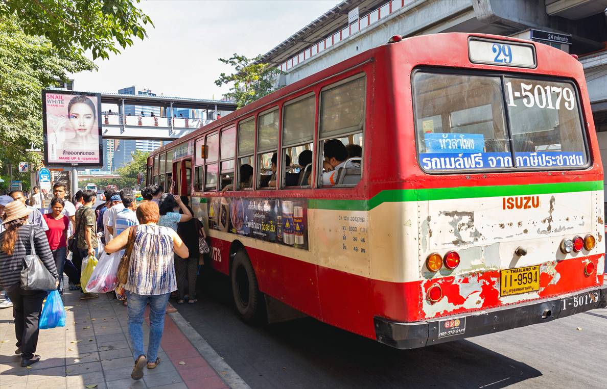 Общественный транспорт в Бангкоке развит достаточно высоко, и до любого места города доехать на автобусе не составит труда. Например, рядом с Королевским дворцом пролегает маршрут более двадцати автобусных рейсов: № 1, 3, 9, 15, 25, 30, 32, 33, 39, 43, 44, 47, 53, 64, 80, 82, 91, 201, 203, 501, 503,508, 512. В зависимости от протяженности поездки, стоимость билета на столичных автобусах насчитывает от 5 до 25 батов, что вполне экономно, даже если путь длинен и с несколькими пересадками.