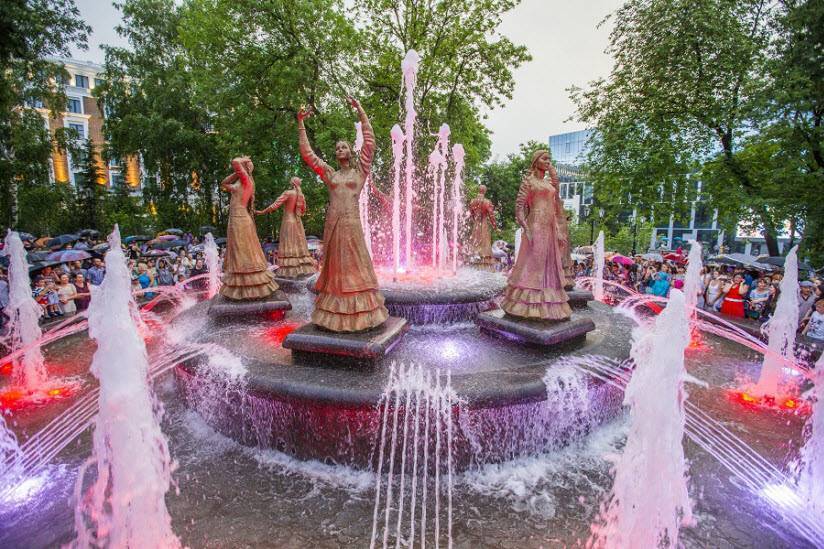 В Уфе много красивых фонтанов, но самым колоритным из них считается тот, что расположен у Театра оперы и балета. В центре 18-метрового бассейна установлен круглый каменный пьедестал, по периметру которого размещены семь 2-метровых бронзовых изваяний девушек в национальных костюмах. Сопла гейзеров установлены на специальном возвышении между скульптурами и в основной чаше. Вечерами, когда включается разноцветная подсветка, создается ощущение, что красавицы плывут над водой. Композиция создана по мотивам национальной легенды, повествующей о семи девушках, некогда бросившихся со скалы в воды реки Белой, чтоб не попасть в руки жестоких завоевателей.