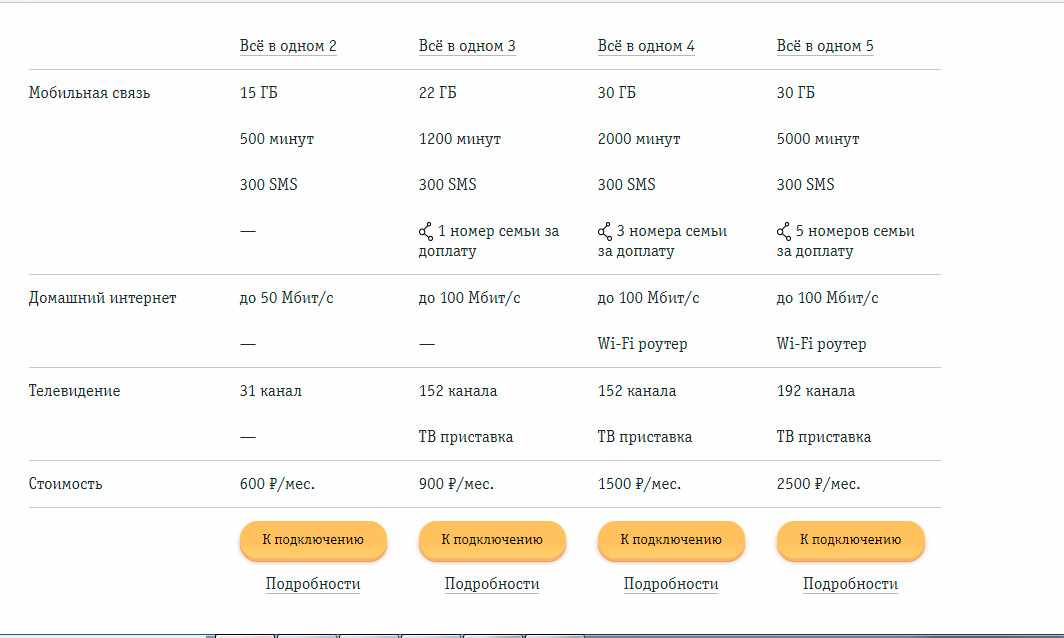 | Дом. интернет | до 100 Мбит/с | до 100 Мбит/с Wi-Fi роутер | до 100 Мбит/с Wi-Fi роутер |