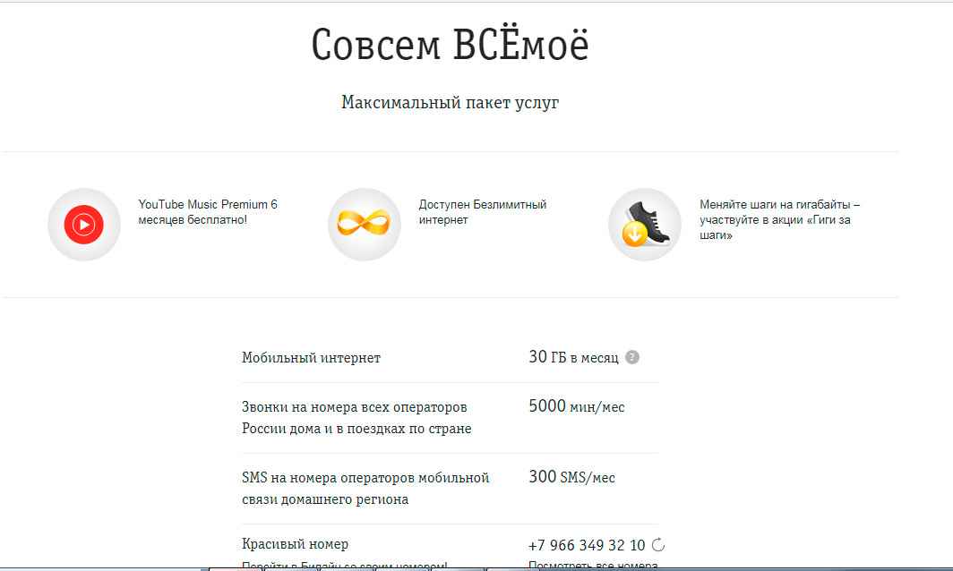 Похож на предыдущий тариф, но включает больший пакет для общения. За ежемесячные 2500 рублей оператор начисляет 30 гигабайт интернета, 300 SMS и 5000 минут для вызовов по России.