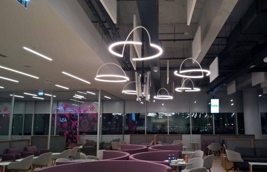 Очень необычный дизайн. Который и не напрягает, как во Внуково и не отталкивает. Зал по размеру довольно маленький. Думаю максимум что он в себя вместит — это 30-40 человек. Но зал разделен на множество зон, которые позволяют комфортно отдыхать и не мешать окружающим: