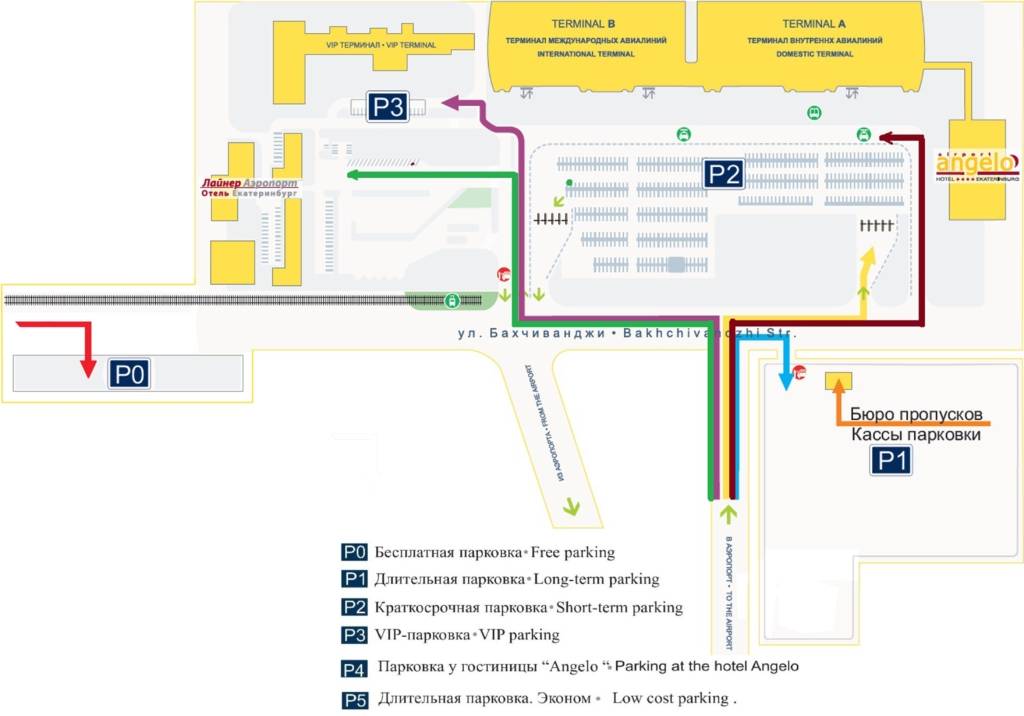 Правила пользования всеми парковками аэропорта одинаковы. На въезде выдается парковочный талон, а при выезде – его возвращают. Оплата производится в паркоматах. Схема парковок аэропорта: