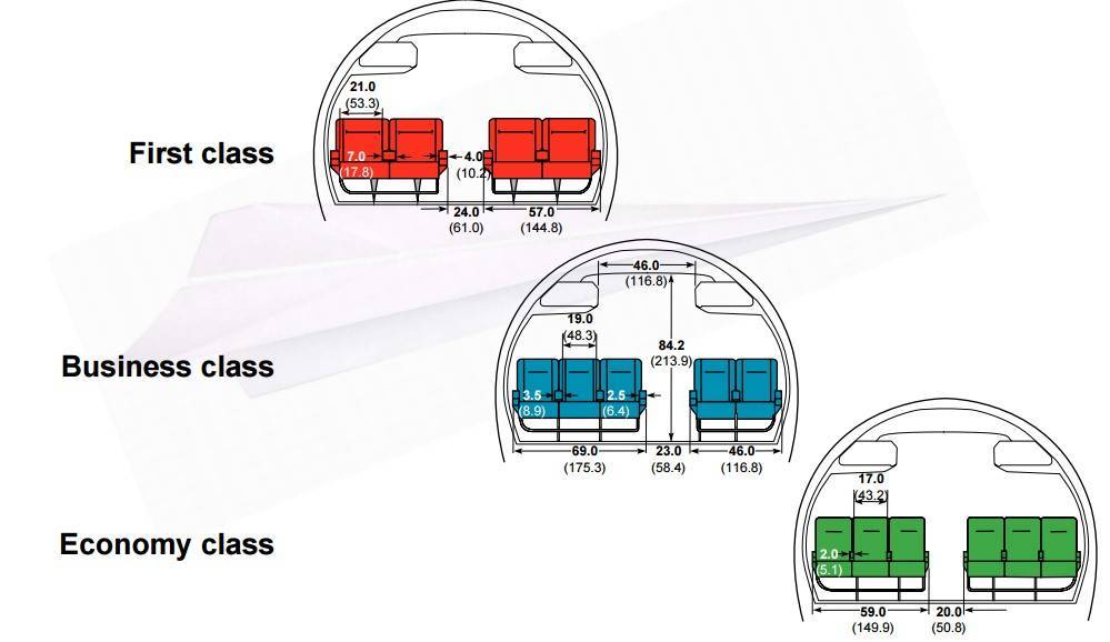 - По обе стороны от самолета есть еще один коридор, ведущий к аварийным выходам. Затем следует еще один ряд сидений с дополнительным пространством для ног по обе стороны от основного прохода. Количество посадочных мест — шесть.