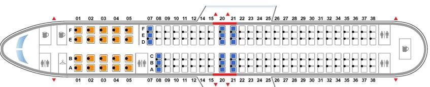 Места в данном авиалайнере расположены по схеме 3+3. Места, расположенные вблизи с проходом имеют одну особенность, у них установлен откидывающийся подлокотник, благодаря нему пассажиры могут спокойно выбраться с кресла не пытаясь протиснуться между углом подлокотника и впередистоящим креслом.