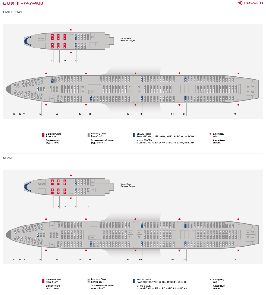 Для авиакомпании Россия у Boeing 747 400 схема салона представлена двумя этажами, что позволяет перевезти воздушным судном большее количество людей.