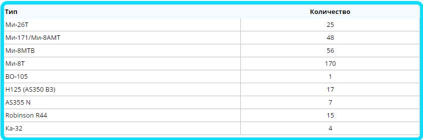 В вертолетном парке 338 единиц техники. Его представители Ми-171, Ми-8Т, Ка-32, Ми-8МТВ, AS.335 и другие типы.
