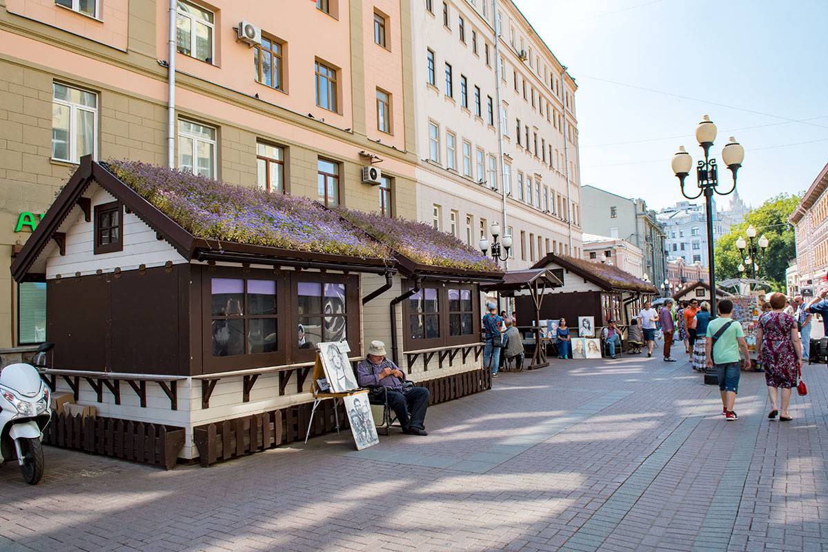 Разнообразные инсталляции регулярно сменяют друг друга на Старом Арбате. Особенно красива улица на новогодних праздниках, хотя и в другие сезоны есть чем полюбоваться. На этот раз Старый Арбат украсила целая вереница живописных павильонов с «цветочными» крышами.