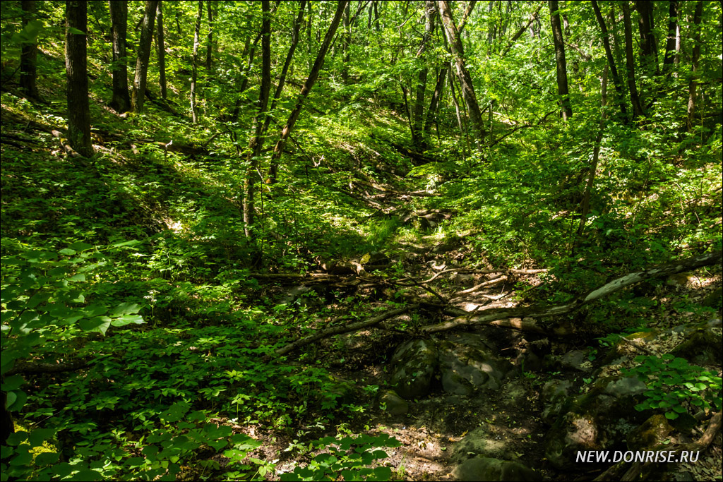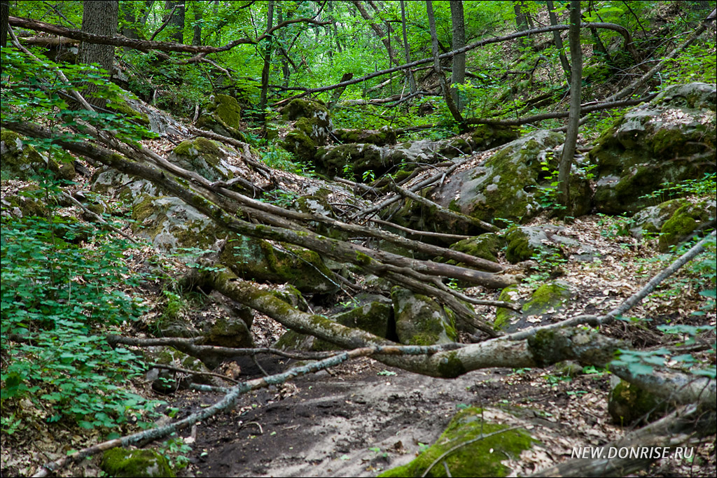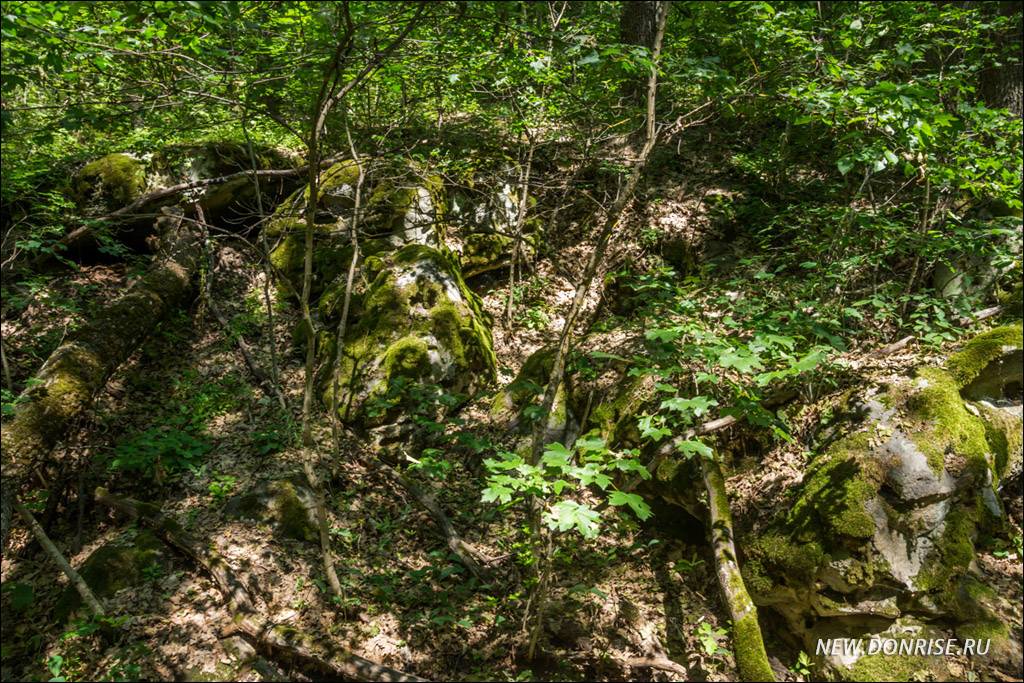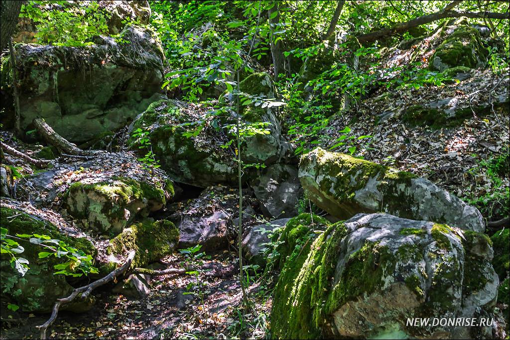 Если всё–таки пробраться в нужном направлении, по основному руслу, внезапно балка приобретает обычный вид. Вокруг — типичный байрачный лес севера Ростовской области. Здесь камни затянуты выносами из отножин, завалены стволами упавших деревьев, и разглядеть их довольно сложно.