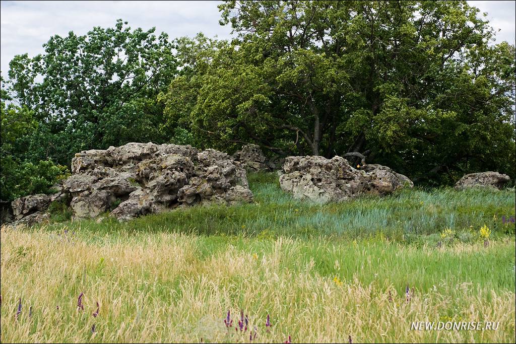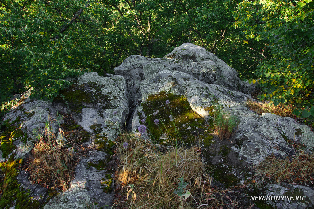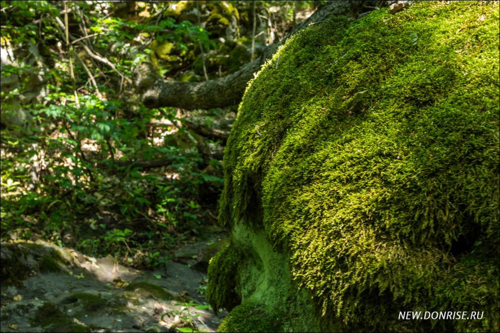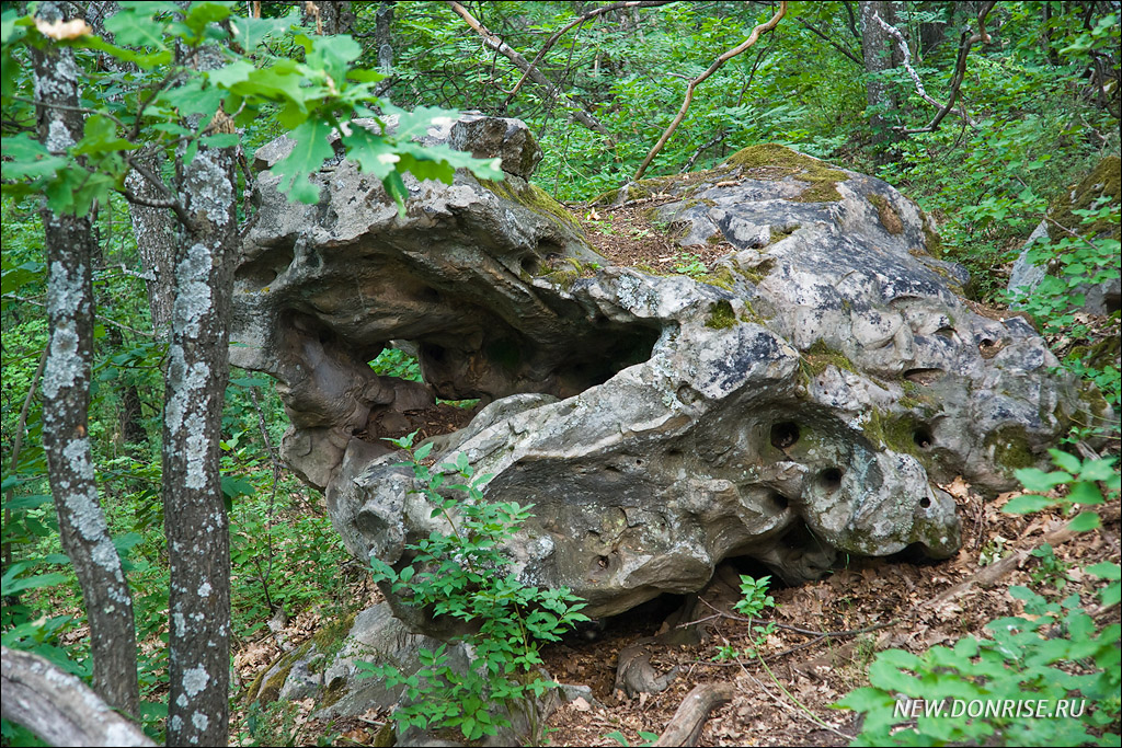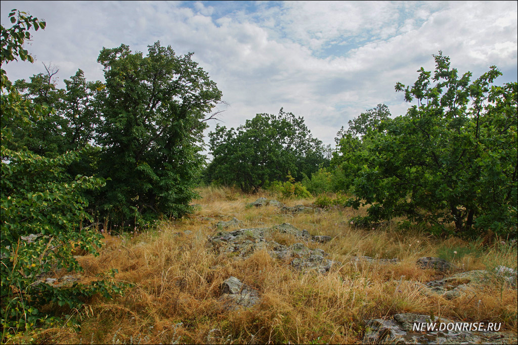 Если всё–таки пробраться в нужном направлении, по основному руслу, внезапно балка приобретает обычный вид. Вокруг — типичный байрачный лес севера Ростовской области. Здесь камни затянуты выносами из отножин, завалены стволами упавших деревьев, и разглядеть их довольно сложно.