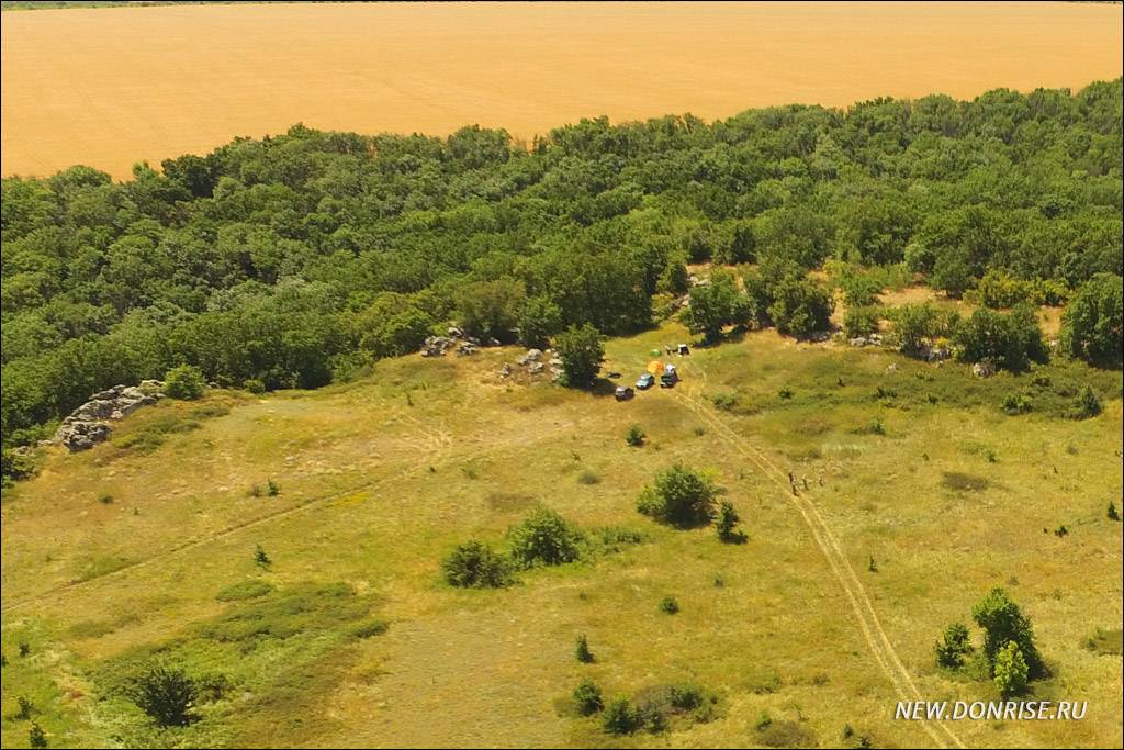 Вид на Гостевую поляну с севера. Видны три участка выхода камней. Аэрофотосъемка — проект НаукаPRO