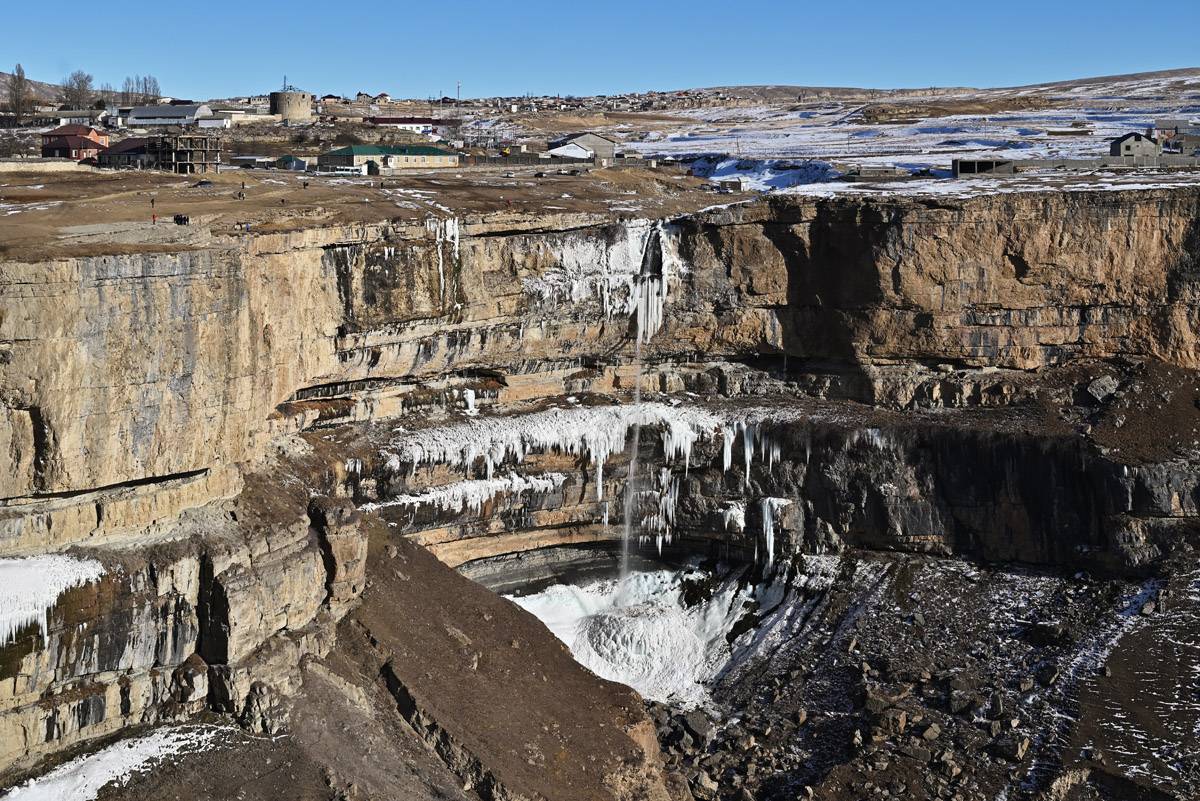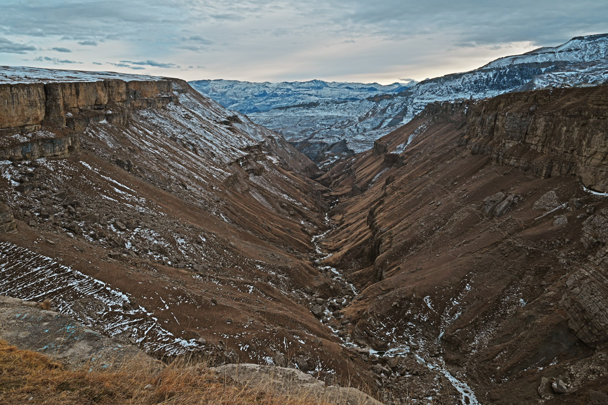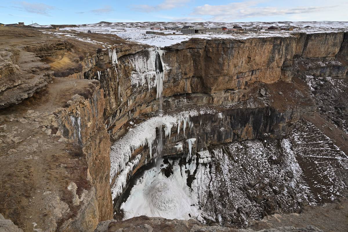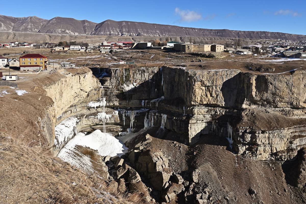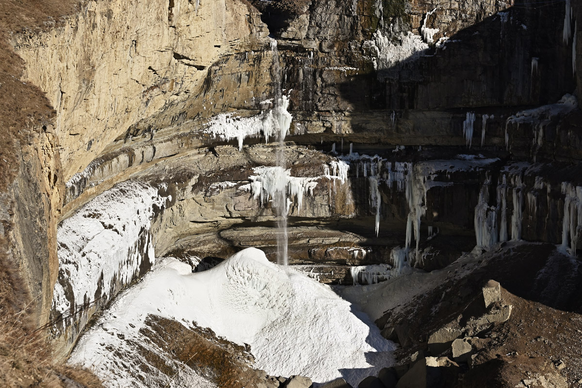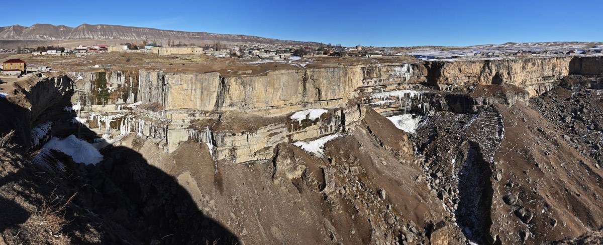 Зимним утром водопад Тобот был освещён солнцем, но падающий рядом Итлятляр скрывала тень. Во второй половине дня наоборот: Итлятляр на свету, а на Тоботе – тень. Зато к вечеру люди со смотровой площадки (GPS 42.552686, 46.717499) в селе Хунзах куда-то исчезли. Утром здесь были толпы туристов, а теперь только мы.
